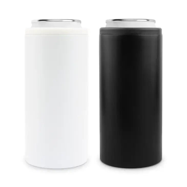Holder and insulator, our slim can cooler does both! With a no-sweat exterior that keeps condensation build-up to a minimum and a double wall design to keep your drink colder for longer, you’ll be taking this stainless steel can cooler with you on all your adventures. Available in your choice of black or white, the slim drink holder is perfect for 12 oz. cans, so you’ve got a holder sized especially to hold your favorite mixed seltzer beverage or skinny beer. It’s a fun, cheap priced gift you can give out as a party favor or as piece of a larger gift set. The awesome metal beverage keeper is perfect for outdoor festivities like a backyard barbecue, pool party, or weekend camping at the lake. Specifications: 2 3/4" (Dia) x 6" (H) x 7cm (Dia) x 15cm (H) Fits Slim 12oz (355mL) Can Screw on Plastic Gasket with Rubber Seal No Sweat Exterior Hand wash only Stainless Steel