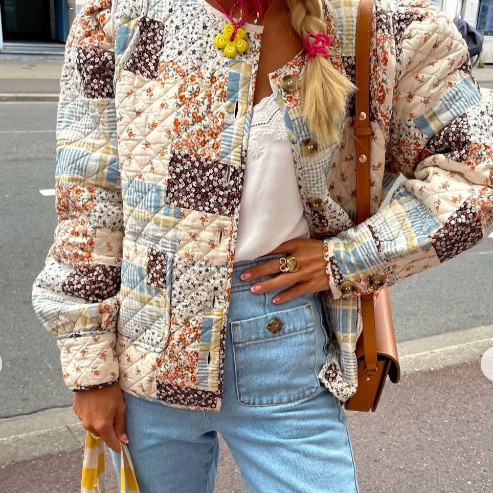 Floral Color Blocks Print Quilted Jacket: Apricot / L