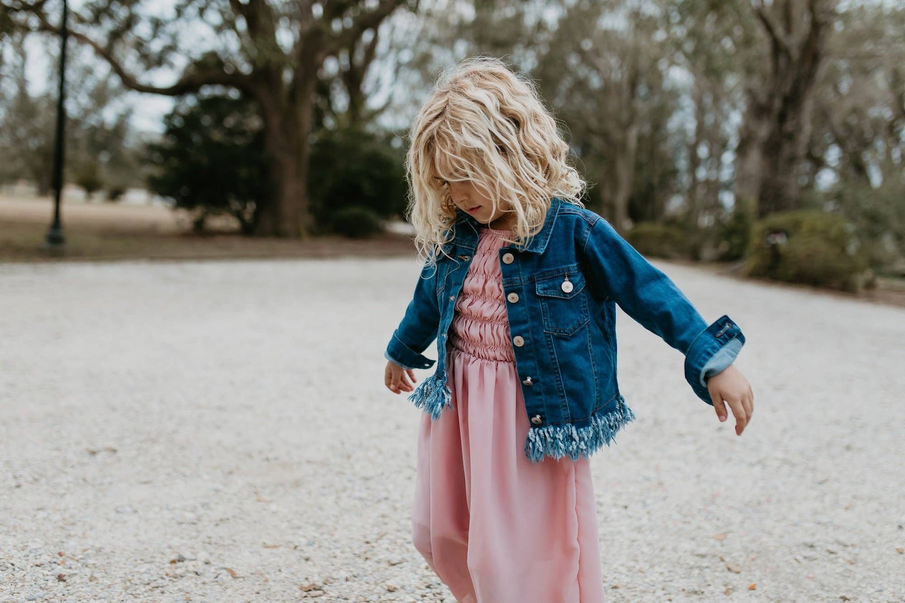 Girls adorable dark distressed denim jacket with long sleeves, buttons and super fun fringe hem detail. Western wear for little cowgirls! 95% Cotton, 5% Spandex