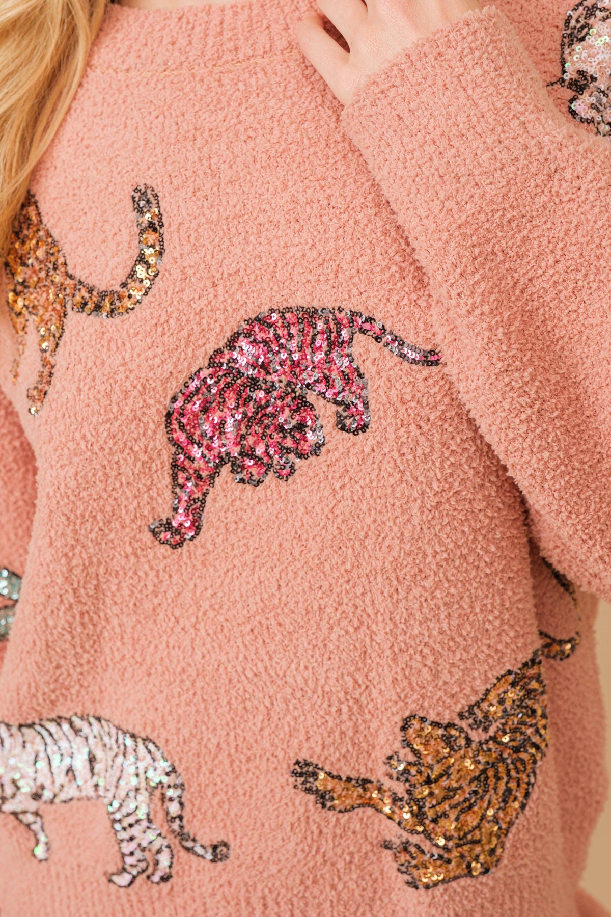 Cozy Multi Tiger Sequin Embellished Loose Lounge Top with Matching Shorts