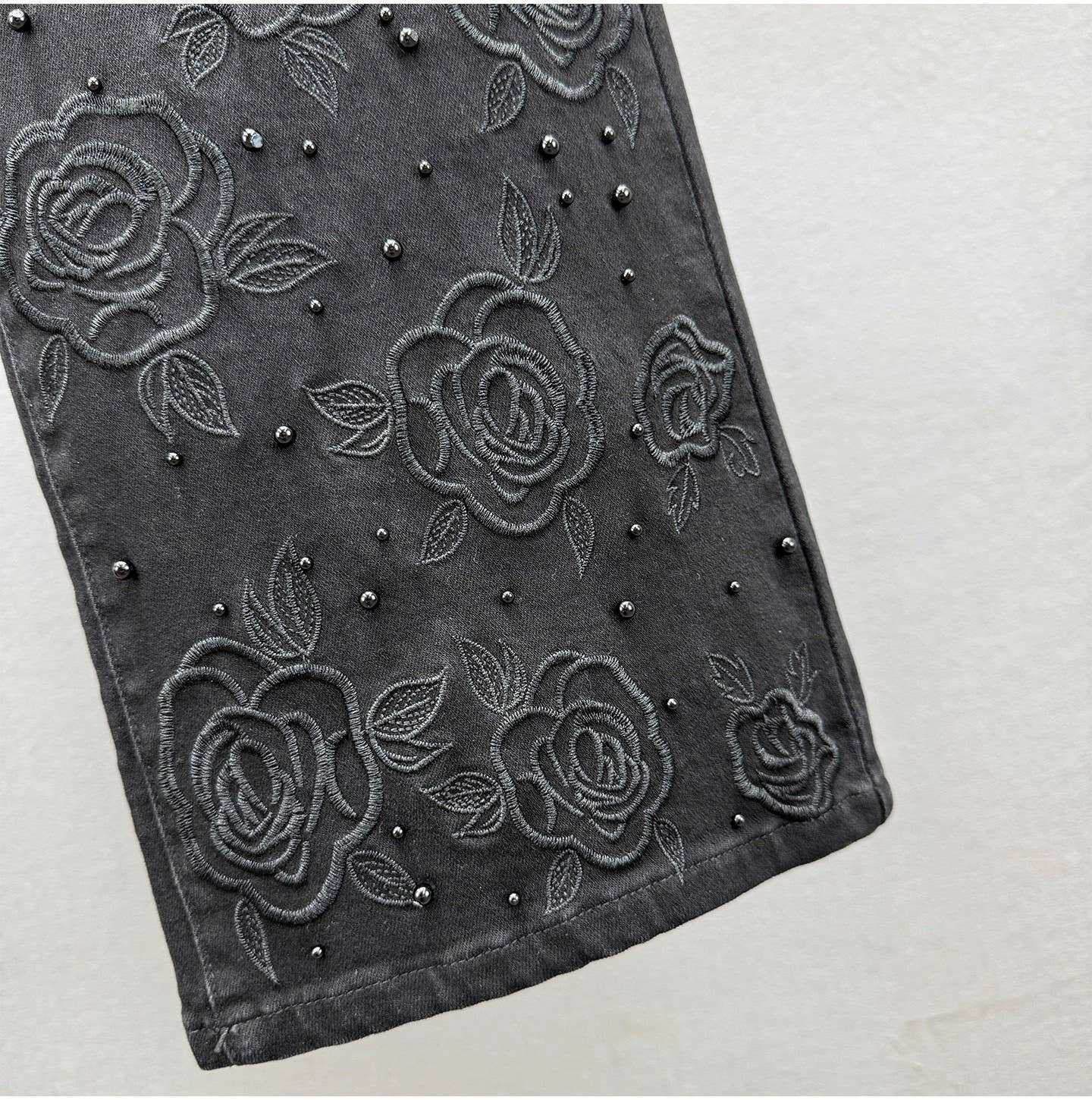 Designed for the 2026 autumn season, these black straight-leg denim pants combine classic tailoring with refined handcrafted details. Made from cotton-blend stretch denim, they offer a comfortable yet supportive fit that moves naturally with the body. The high-waist design enhances the waistline and creates a slimming, elongated silhouette, while the straight-leg cut delivers a clean and timeless look. Delicate embroidery and hand-applied beaded accents add subtle texture and elegance, elevating everyday denim into a standout fashion piece. Easy to style with blouses, knitwear, or structured outerwear, these pants are ideal for work, casual outings, or polished street-style looks.