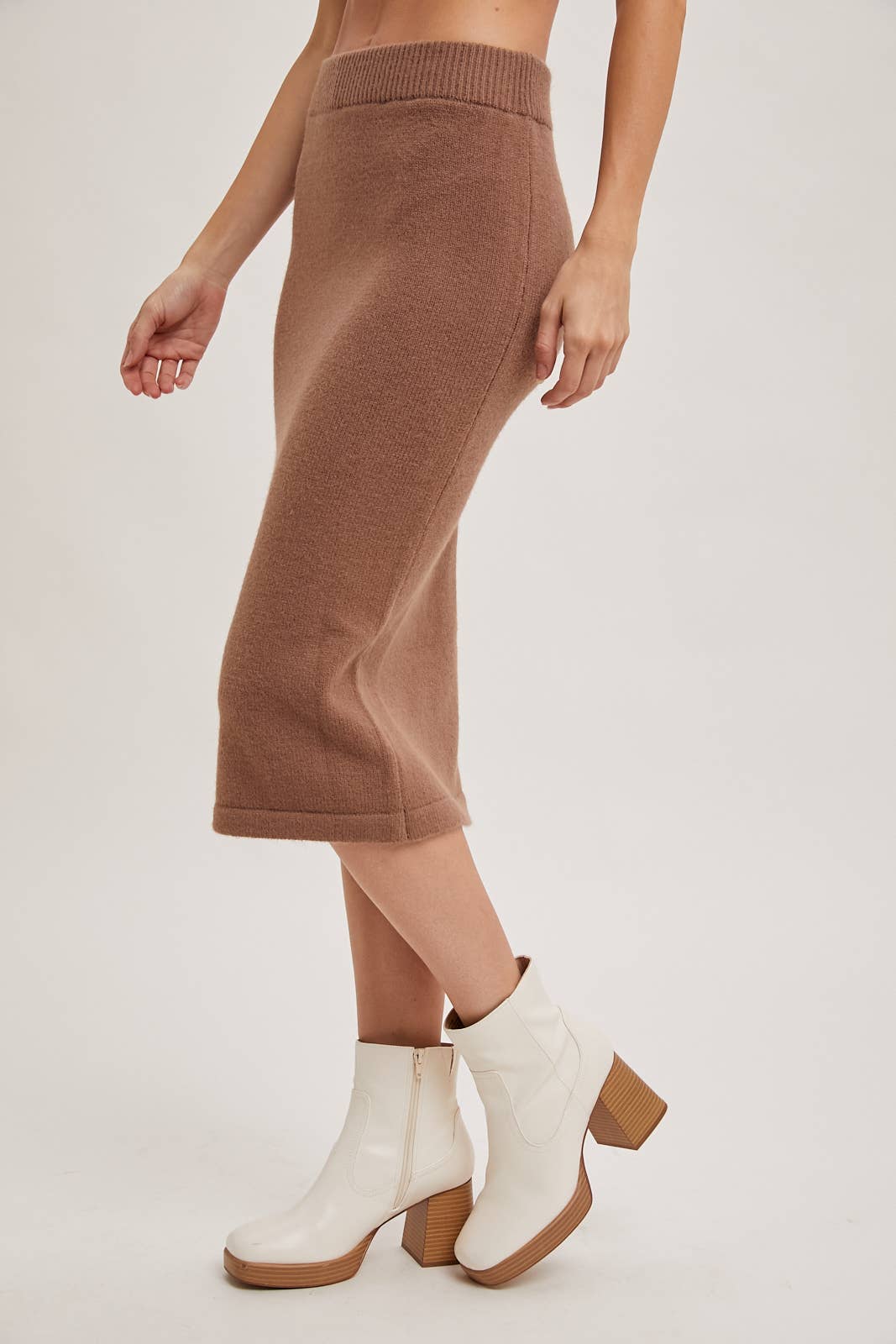 The knit hoodie top and pencil skirt set is a chic and comfortable outfit that blends casual style with a touch of sophistication. The hoodie top features a relaxed fit with a cozy hood, offering laid-back comfort and a trendy look. Paired with a matching pencil skirt, this set creates a sleek silhouette, balancing the casual vibe of the hoodie with the elegance of the skirt's form-fitting design. Perfect for both lounging and casual outings, this set can be styled with sneakers for a sporty look or dressed up with boots for a more polished ensemble. -Model is 5'9" and wearing a Small
